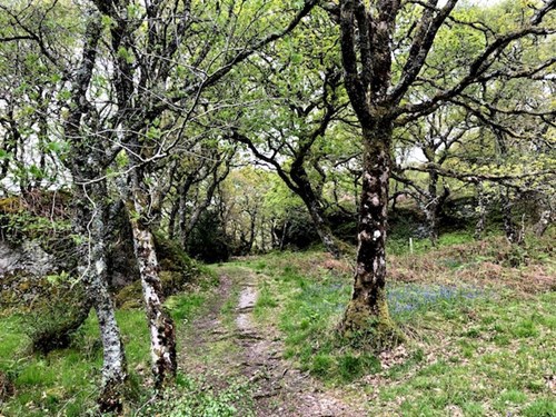 I drop down the other side of the hill, toward the shore, scrambling around rocks and picking my way through the bluebells until I reach West Glenan Burn. Tracking the burn inland, I follow the path roughly north, heading back into the woods.